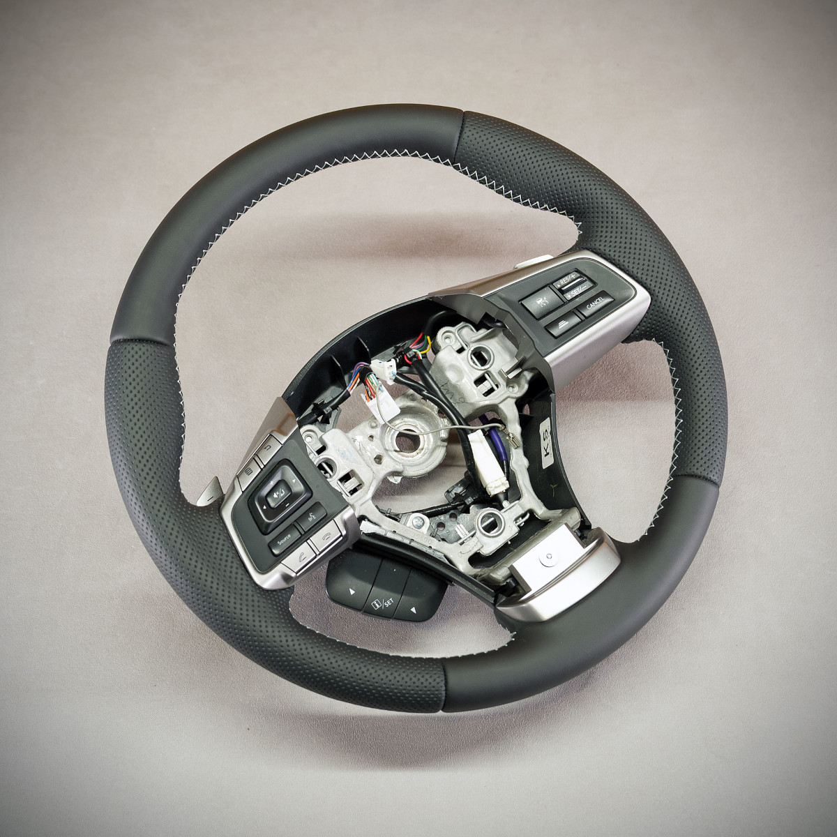 Obszycie kierownicy Subaru Forester nadało jej zupełnie nowego wyglądu. Kierownica została obszyta skórą gładką Nappa oraz skórą perforowaną. Skóra gładka zapewnia bardzo przyjemny dotyk, jak i niezwykłą trwałość. Skóra perforowana nadaje komfort trzymania poprzez dziurki, które nie są wykonane na wylot a jedynie wytłoczone w skórze.