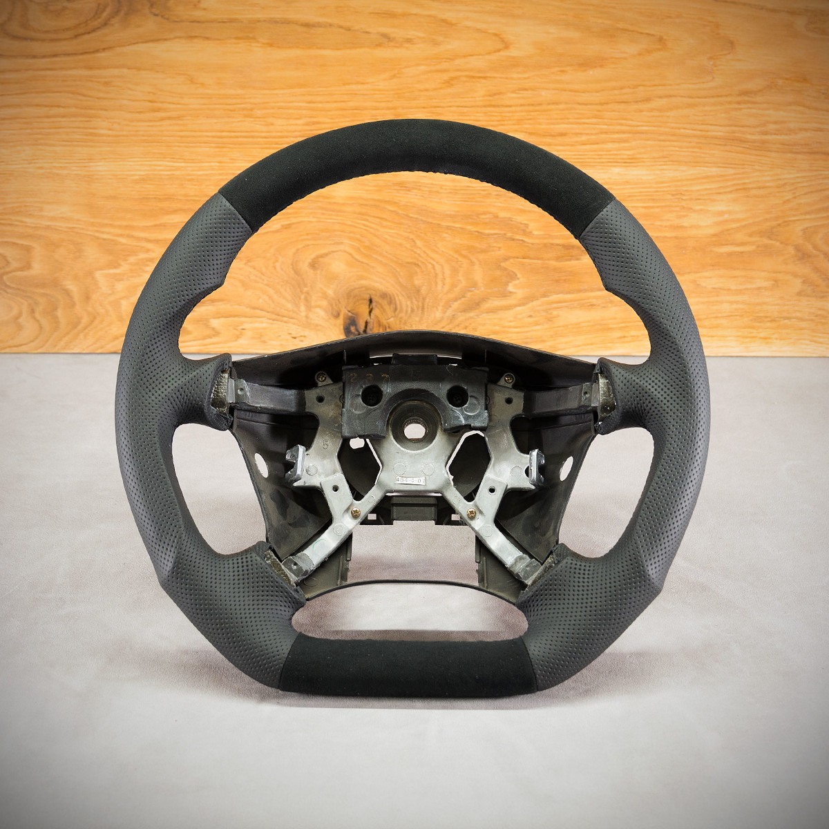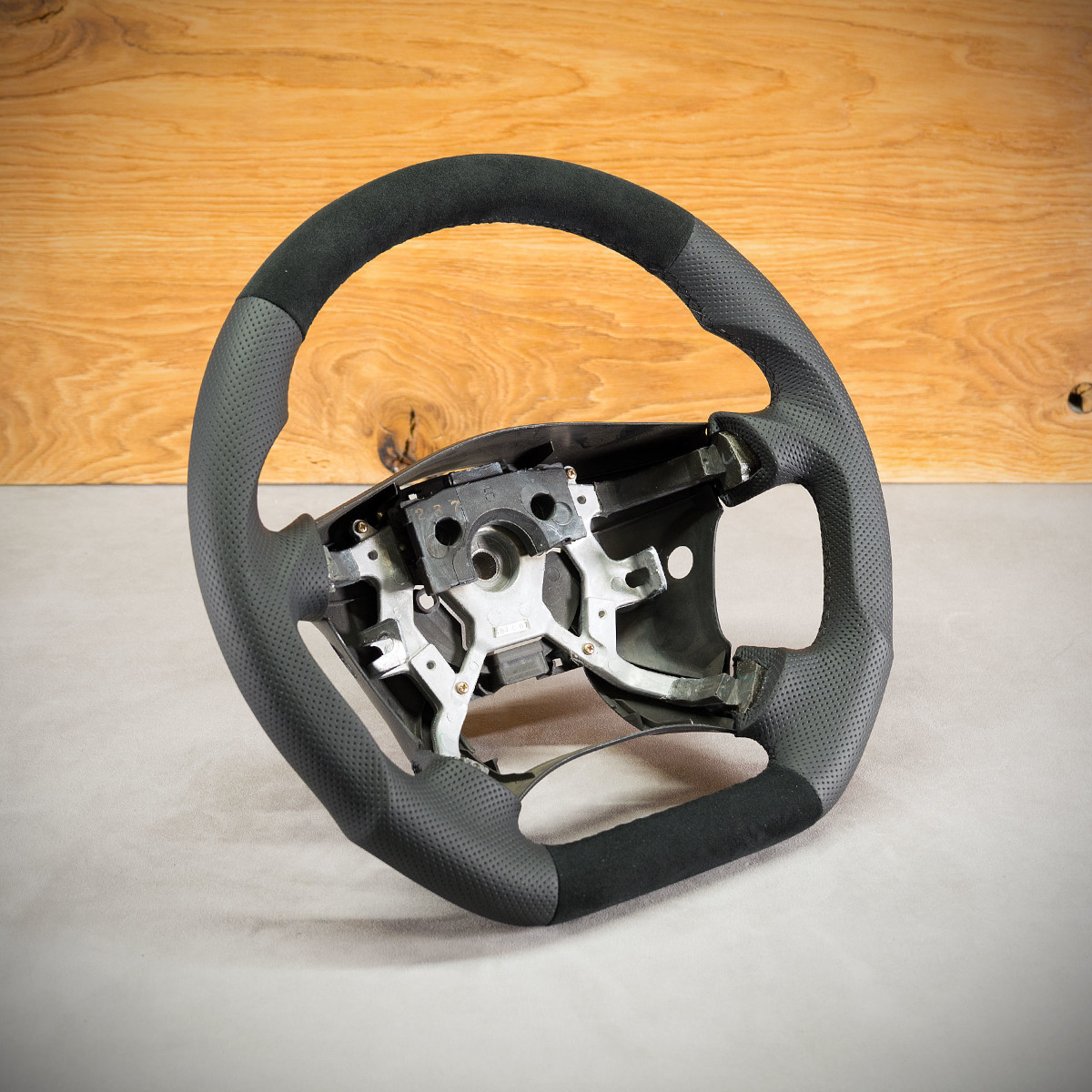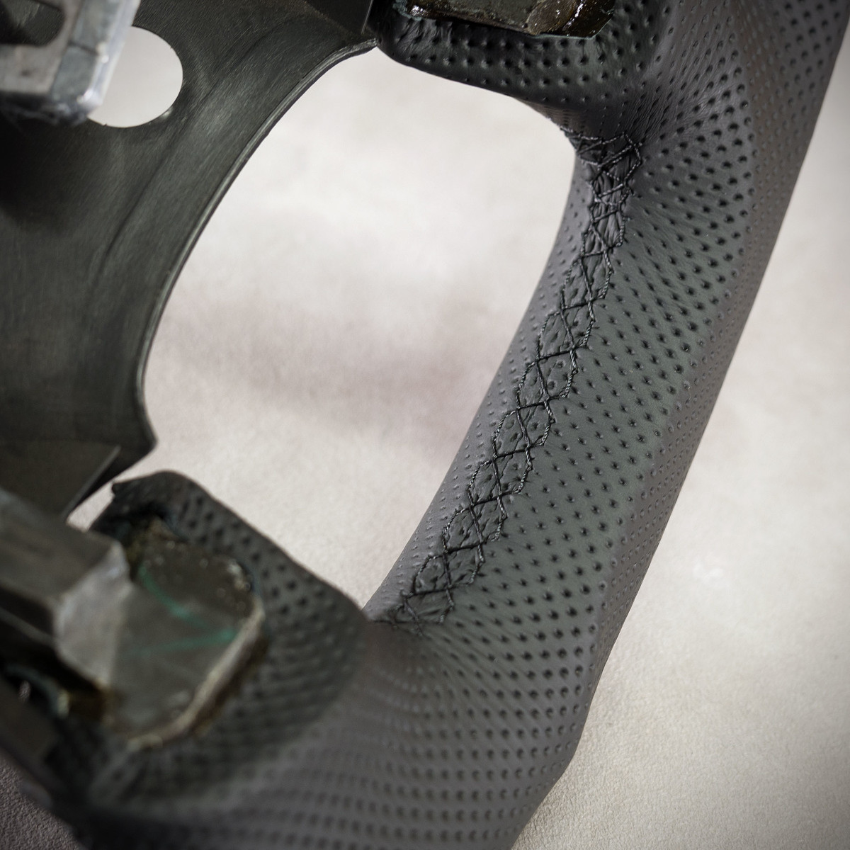 Bardzo wyraźny tuning kierownicy Nissan Patrol Y61 poprzez połączenie modyfikacji oraz obszycia. Kierownica obszyta skórą gładką oraz perforowaną. Są to skóry najlepszego gatunku dostępne na rynku europejskim. Skóra gładka zapewnia bardzo przyjemny dotyk, jak i niezwykłą trwałość. Skóra perforowana zalecana jest na boki kierownicy. Perforacja, czyli dziurki, nie są wykonane na wylot a jedynie wytłoczone w skórze. To nadaje komfort trzymania.