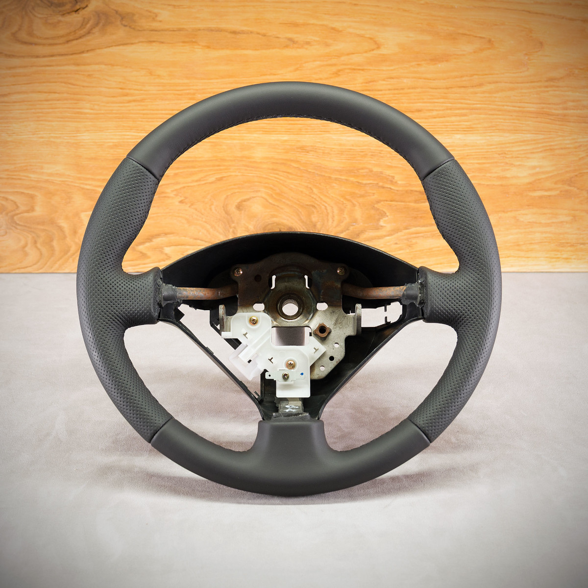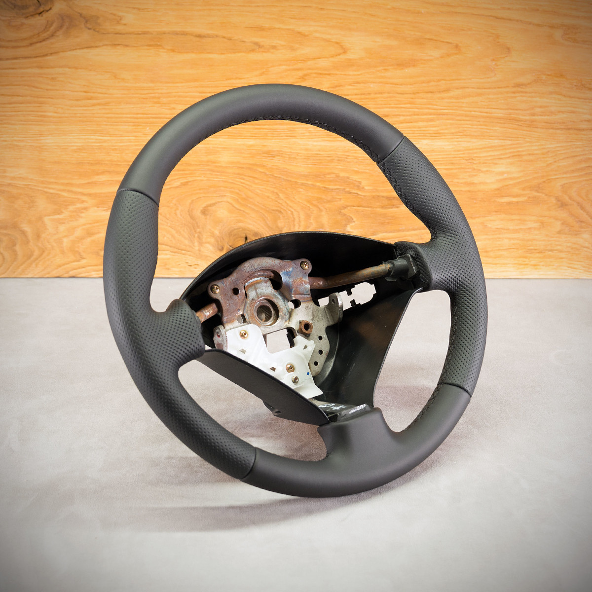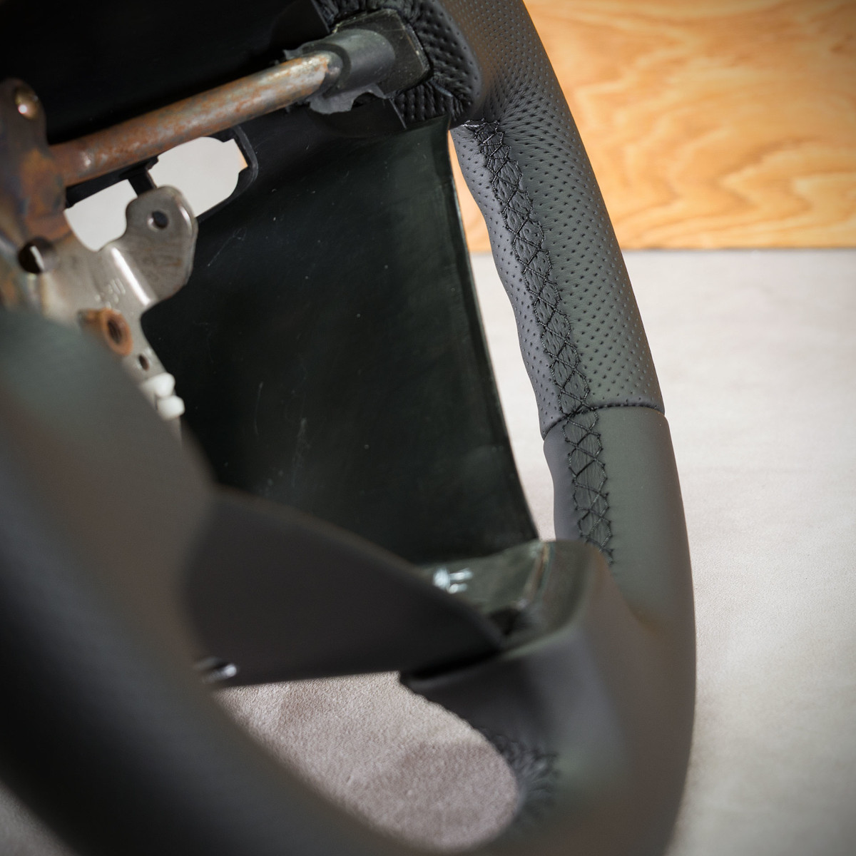 Tuning kierownicy Honda Prelude 5 poprzez połączenie modyfikacji oraz obszycia. Kierownica obszyta skórą gładką oraz perforowaną. Skóra gładka zapewnia bardzo przyjemny dotyk, jak i niezwykłą trwałość. Skóra perforowana nadaje komfort trzymania. Szew seryjny jest najczęściej wybieranym szwem przez naszych klientów, tym razem użyliśmy nici w kolorze głębokiej czerni.
