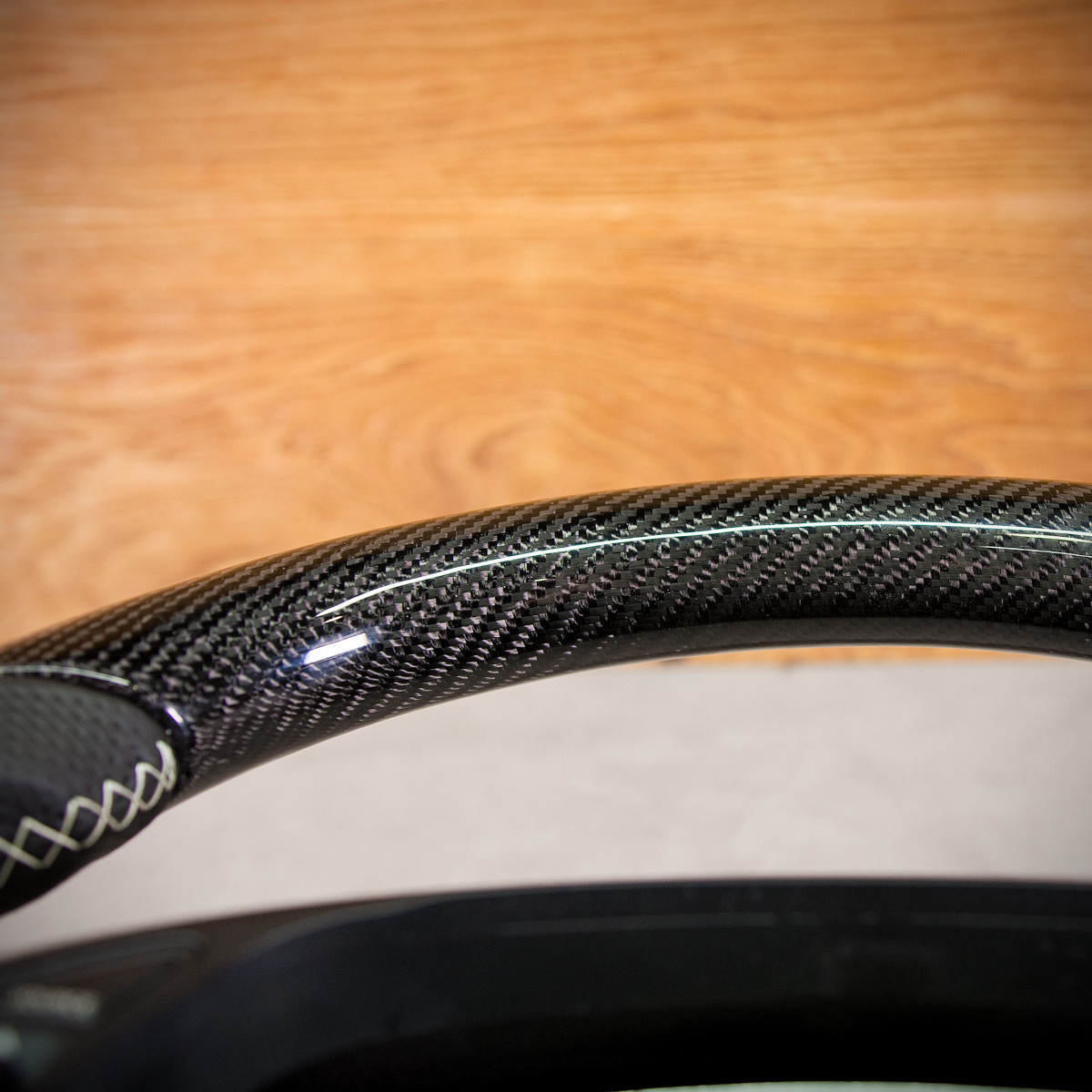 Boki kierownicy zostały obszyte skórą perforowaną. Perforacja, czyli dziurki, nie są wykonane na wylot a jedynie wytłoczone w skórze. To nadaje komfort trzymania. Dolna i górna część kierownicy została uszlachetniona włóknem węglowym. Włókna węglowe są materiałem nowej generacji. Charakteryzują się wysoką trwałością i niezrównaną lekkością. Początkowo były używane tylko w przemyśle lotniczym i dopiero niedawno zostały wykorzystane w sektorze komercyjnym.
