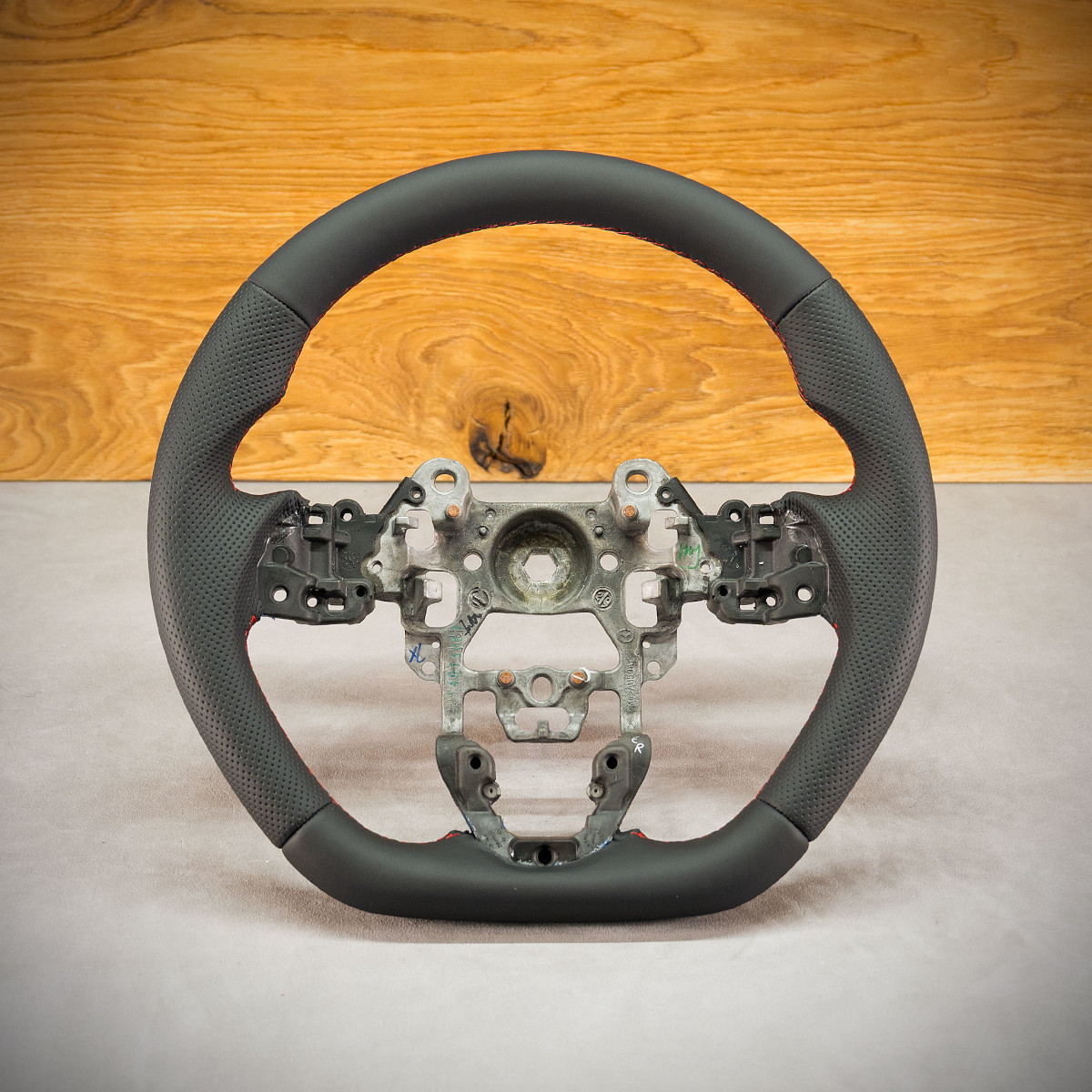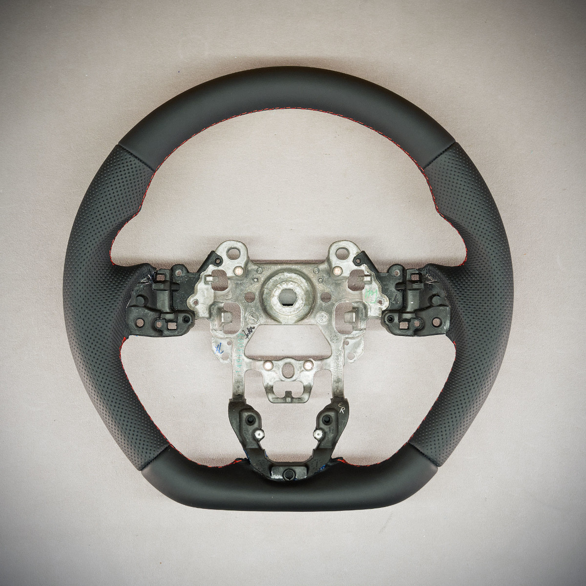 Bardzo wyraźny tuning kierownicy Mazda CX-5 poprzez połączenie modyfikacji oraz obszycia. Kierownica obszyta skórą gładką oraz perforowaną. Są to skóry najlepszego gatunku z dostępnych na rynku europejskim. Skóra gładka zapewnia bardzo przyjemny dotyk, jak i niezwykłą trwałość. Skóra perforowana zalecana jest na boki kierownicy. Perforacja, czyli dziurki, nie są wykonane na wylot a jedynie wytłoczone w skórze. To nadaje komfort trzymania. Szew seryjny jest najczęściej wybierany.